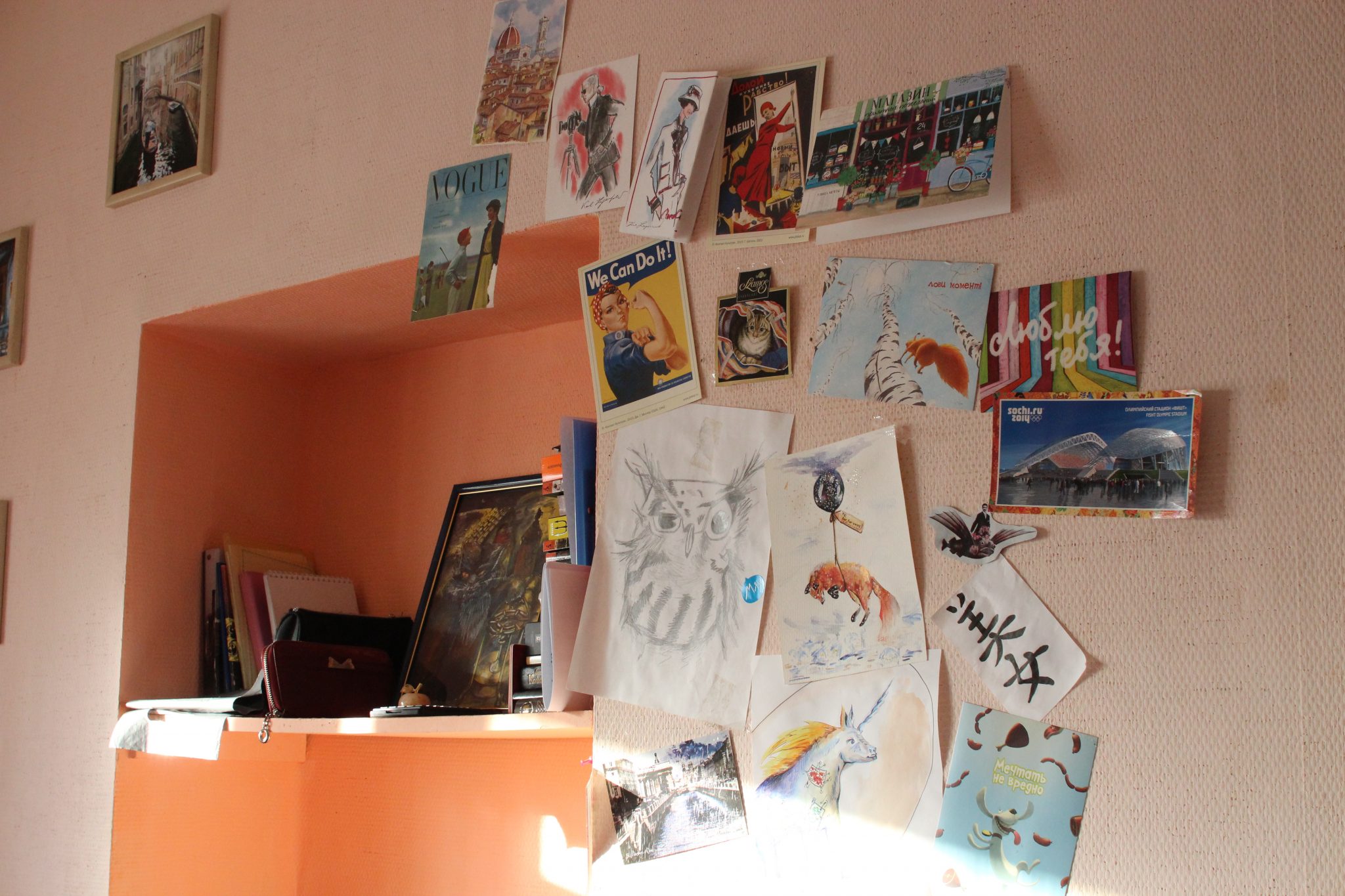 - Стены украшены рисунками/картинами/фотографиями студентов;
