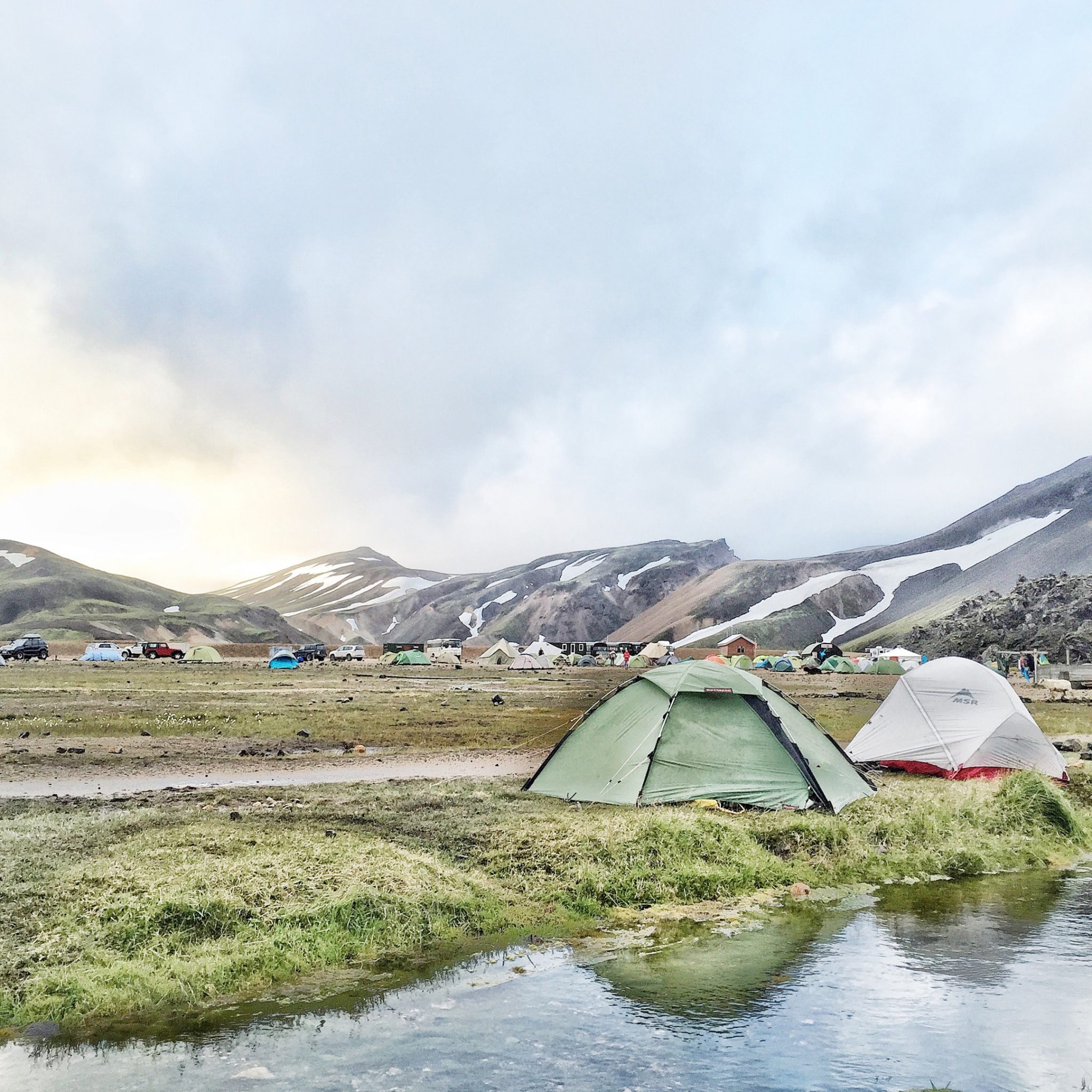 Самый живописный кемпинг-лагерь можно встретить в районе гор Ландманналаугар – еще одно непростое название и еще одно место, от которого море впечатлений. И хоть услуги типа зарядки и душа тут оплачиваются дополнительно, в 100 метрах от рецепшена находятся бесплатные термальные источники, которые так популярны у туристов в Исландии, а выбравшись отсюда в часовой хайкинг, можно полюбоваться невероятными «карамельными» горами.