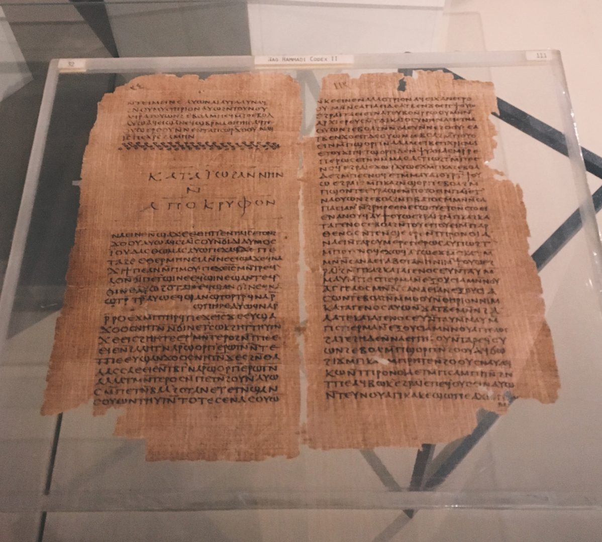 Жемчужина собрания — фрагмент одного из кодексов Библиотеки из Наг-Хаммади (собрание рукописных книг (кодексов), изготовленных из папируса, которое было обнаружено в конце 1945 года в районе селения Наг-Хаммади (Египет) — прим. автора), датируемых IV в. н.э. Мало кто знает, но монашество как феномен зародилось именно в Египте. Данные свитки предположительно принадлежат авторству монахов первого христианского монастыря, основанного отцом-пустынником, преподобным Пахомием Великим.