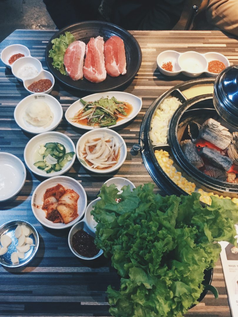 Если вы любите мясо, то ищите по близости корейскую барбекюшную. В каждый стол там встроен гриль, а над ним вытяжка. Вам приносят закуски, и вы заказываете сырое мясо, чаще всего свинину. Потом кладете его на гриль и переворачиваете, в самом конце специальными ножницами режете на кусочки, заворачиваете в лист салата и кидаете все, что вам нравится из закусок. Так вкуснее всего. За тарелку с тремя увесистыми кусками мяса (хватает наесться одному) придется отдать около 40 юаней, иногда встречается «безлимит» — мясо подносят вам пока не лопнете, юаней за 80-100 на человека.