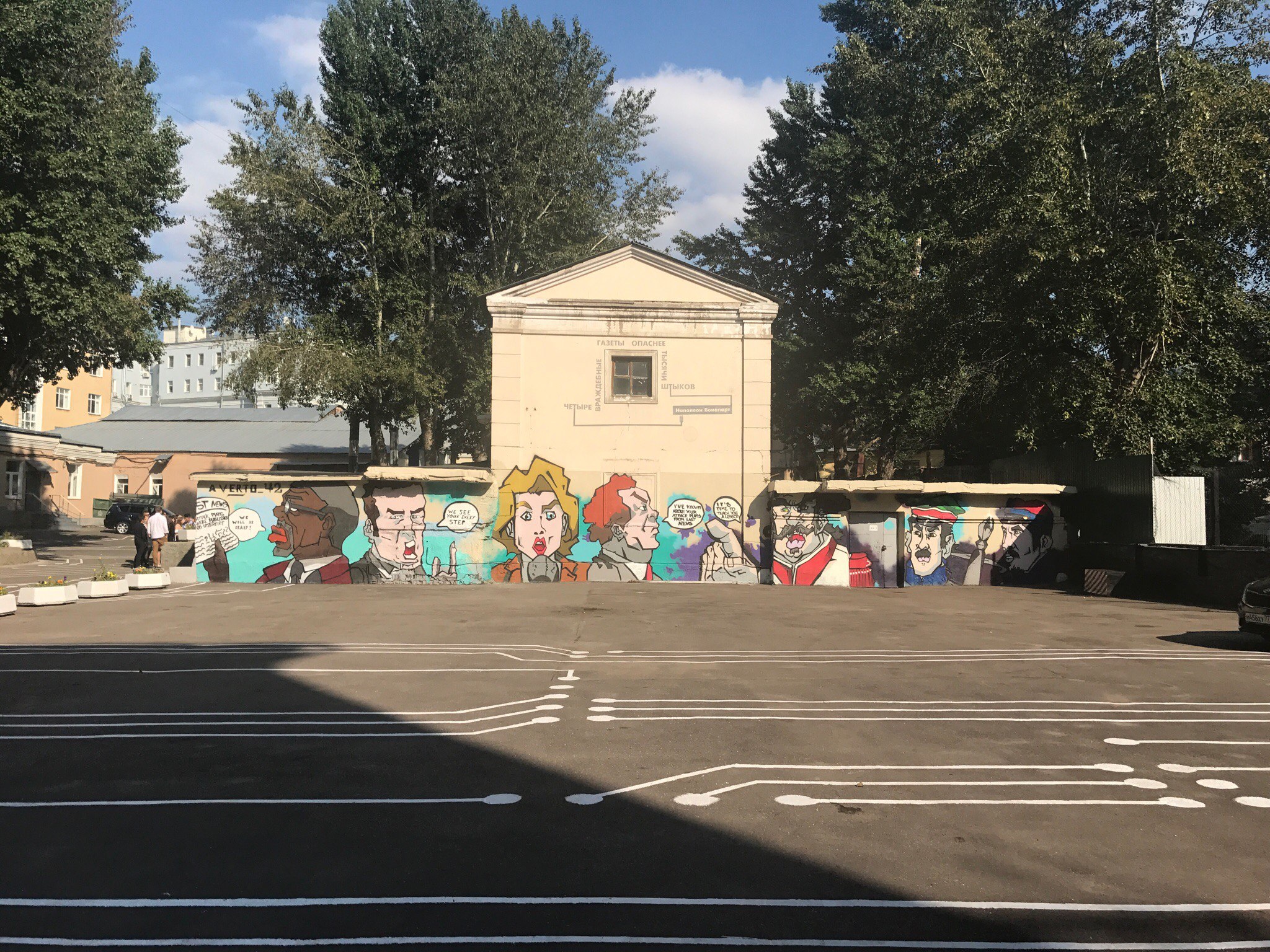 По мере согласования эскизов я добавлял или убирал некоторые детали. Изначально я нарисовал слишком колоритных персонажей. К примеру, персонаж-афроамериканец был изображен в фиолетовом пиджаке, и кто-то подумал, что это сутенер. Поэтому я постарался сделать персонажей нейтральными настолько, чтобы не возникало негативных подтекстов, и выразительными в такой степени, чтобы в их образах четко читалась идея. На реализацию граффити понадобилось шесть дней. В целом было круто, я рисовал в свое удовольствие, хотя жара и осложняла процесс.