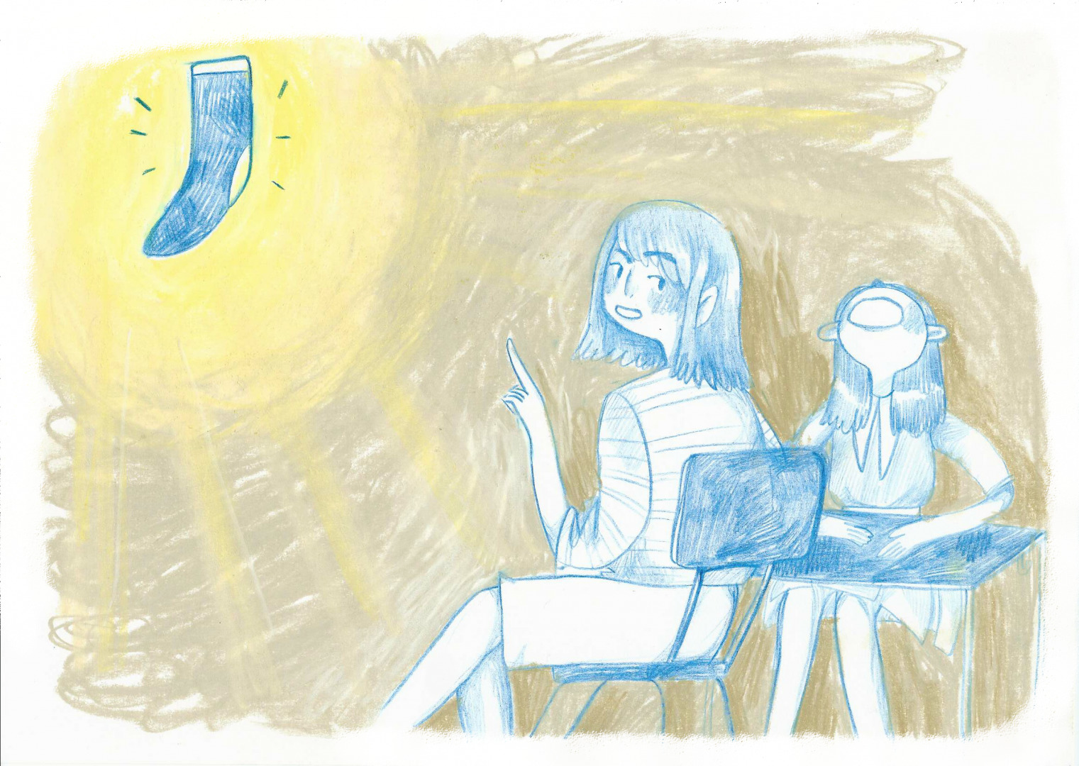 Вскоре записка дошла до еще одного из наших одногруппников. Его реакция мне, пожалуй, запомнилась больше всех. Он выпучил глаза, затем медленно поднял голову кверху, и, сперва, не найдя ничего на потолке, принялся крутить головой из стороны в сторону в поисках злосчастного носка.