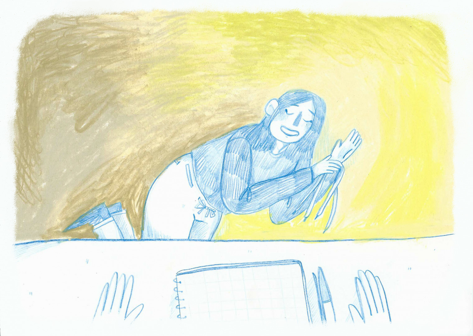 Первым делом я проползла до соседней парты, потому что за ней сидел парень в кроссовках. И он даже ничего не почувствовал! Только когда я, хихикая, поползла вперед, он обратил на меня внимание. Он бросил на меня непонимающий взгляд, а я лишь кивнула на его кроссовки. Не уверена, что он сразу понял меня.