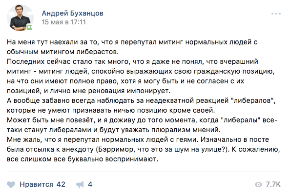 14 мая на проспекте Сахарова прошел митинг против сноса пятиэтажных домов. Перед началом митинга тогда еще омбудсмен Вышки написал на своей странице во «ВКонтакте» пост, который впоследствии был удален: