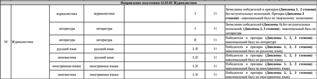 В последнем столбце указана степень достижения на олимпиаде и льгота, которой она соответствует. Большинство олимпиад выдают дипломы трех степеней, но некоторые отмечают только «победителей» и «призеров». В этом случае «победитель» соответствует первой степени, «призер» — второй.