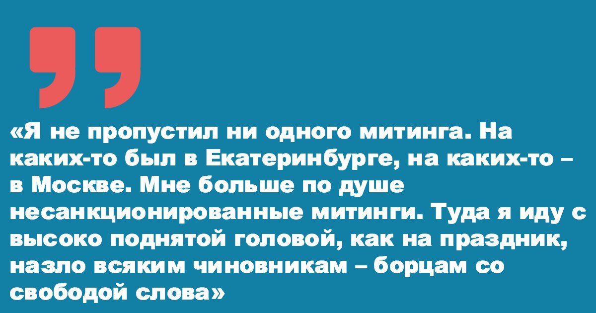 Я не пропустил ни одного митинга. На каких-то был в Екатеринбурге, на каких-то — в Москве. Мне больше по душе несанкционированные митинги. Туда я иду с высоко поднятой головой, как на праздник, назло всяким чиновникам — борцам со свободой слова. Кто они такие, чтобы запрещать мне выражать свою гражданскую позицию и отношение к власти? Жду, когда объявят о следующем мероприятии. Меня долго звать не надо, всегда рад выйти поддержать протест.
