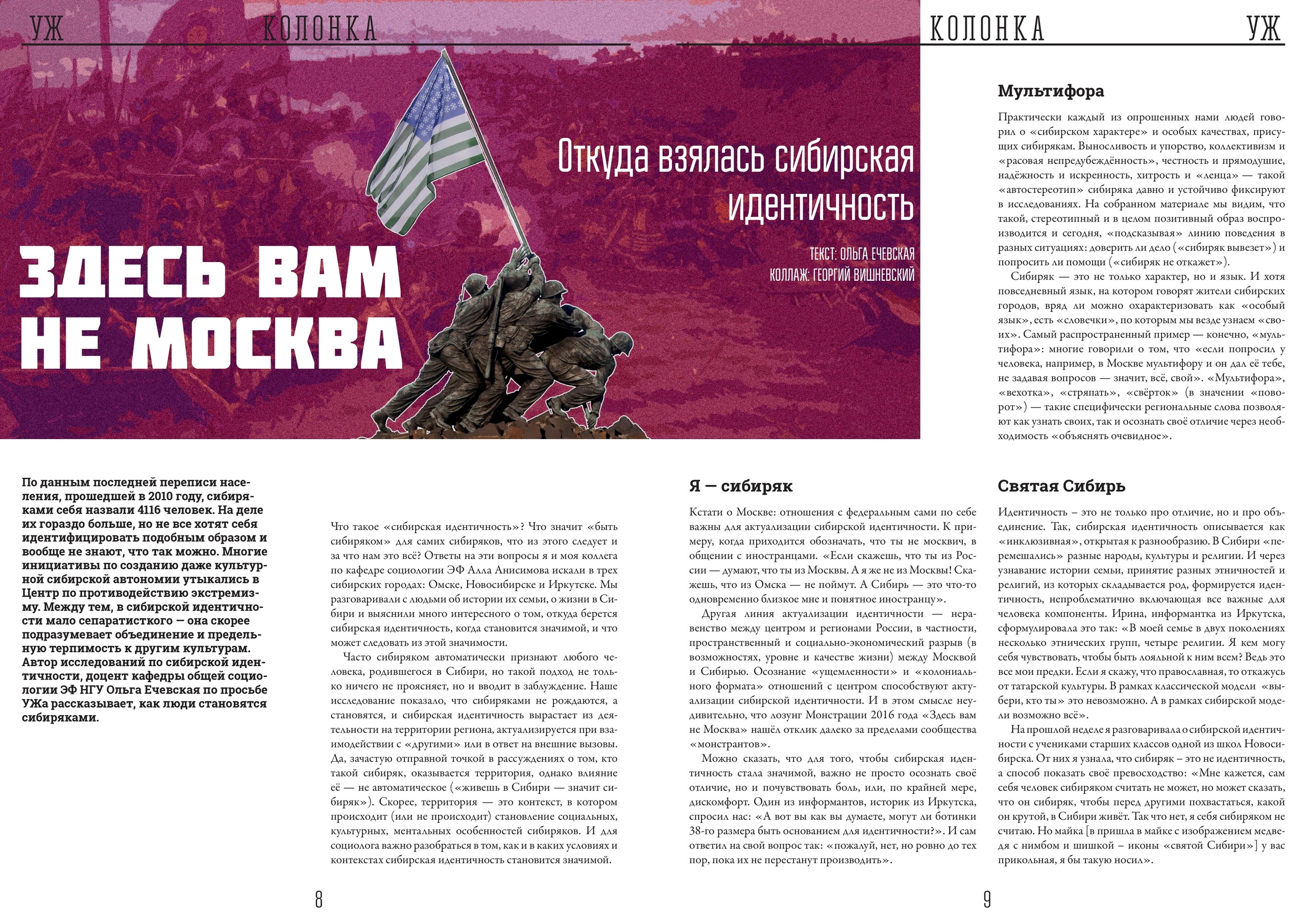 Разворот удаленного номера с колонкой социолога о сибирской идентичности остался в открытом доступе. Колонку оценил Артем Лоскутов, автор ежегодного новосибирского шествия «Монстрация», — делится редакция «УЖа» в своем паблике.