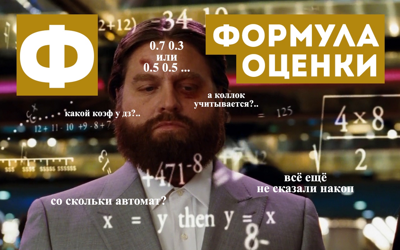 В Вышке есть формула оценки. Например, «Итог = 0,6*Накоп + 0,4*Экз». Это значит, что ваша накопленная оценка, которая может состоять из посещаемости, работы на семинарах, контрольных работ, эссе — в общем, из всего, что вы делали в течение курса — будет весить 60% оценки, которая пойдет в зачетку, а 40% — экзамен. Это позволяет студентам, которые плохо сдали экзамен, но хорошо занимались в течение курса, все-таки закрыть дисциплину на неплохую оценку. Советуем всегда смотреть формулу оценки на старте предмета, чтобы потом не остаться без накопа.