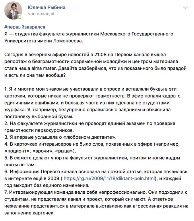 22 ноября Первый канал выпустил репортаж о студентах журфака МГУ, в котором корреспондент Юрий Липатов рассказывает о массовой неграмотности целого поколения. Материал вызвал волну недовольства среди студентов, многие из них опровергали слова Липатова в своих постах в социальных сетях.