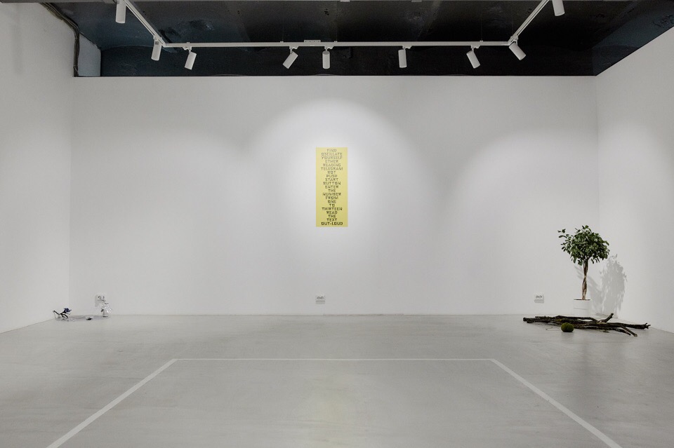 Мне удалось попасть на площадку перед официальным открытием выставки. Александр назначил встречу именно там. Вокруг были белые стены, стул и стол, за которым я сидела, ожидая начала интервью. На потолке висели лампы, повернутые во все стороны, а на полу почему-то лежал зеленый фен с фиолетовым шнурком. Пространство выставки за два дня до начала было почти пустым, что вызывало вполне понятный вопрос: «Если здесь нет ничего, что же здесь будет?».