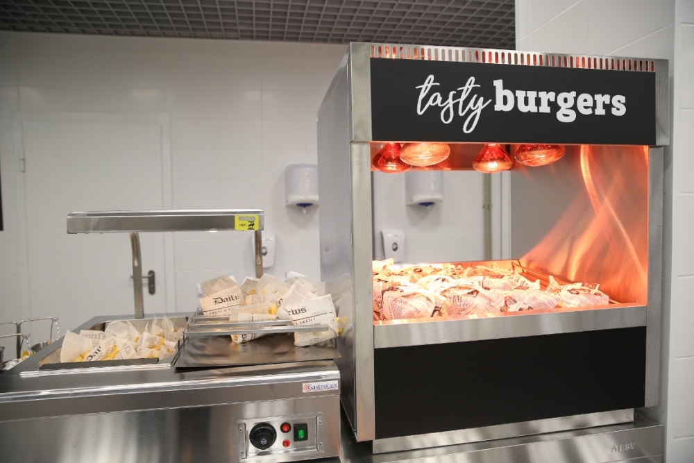 На втором этаже, который работает с 8:30 до 20:00, расположена большая столовая, где можно купить первые и вторые блюда, салаты или, например, комплексный обед за 110 рублей. На первом — кафетерий, где можно попробовать картофель фри за 60 рублей, бургеры с курицей или говядиной за 170 или 180 рублей, блины с разными начинками, пиццу и пасту, фрукты и овощи, напитки — большой стакан капучино обойдется в 110 рублей, а смузи — в 150. Расплатиться можно наличными, картой и PayPass.