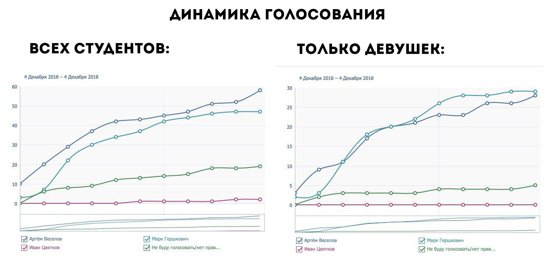 Марк отметил, что его позиция обусловлена не политическими взглядами, а несогласием с конкретными действиями конкретной студенческой организации (речь идет о ВШР). В его программе указаны и другие задачи: отмена обязательного статуса студенческой оценки преподавания и обеспечение качественной помощи студентам от команды опытных юристов. Бывший председатель студсовета Вышки Дмитрий Овакимян в своём Telegram-канале рассказал о небольшом анализе предварительного голосования за кандидатов в группе студсовета. Оказалось, что больше всего девушек проголосовало именно за Марка.