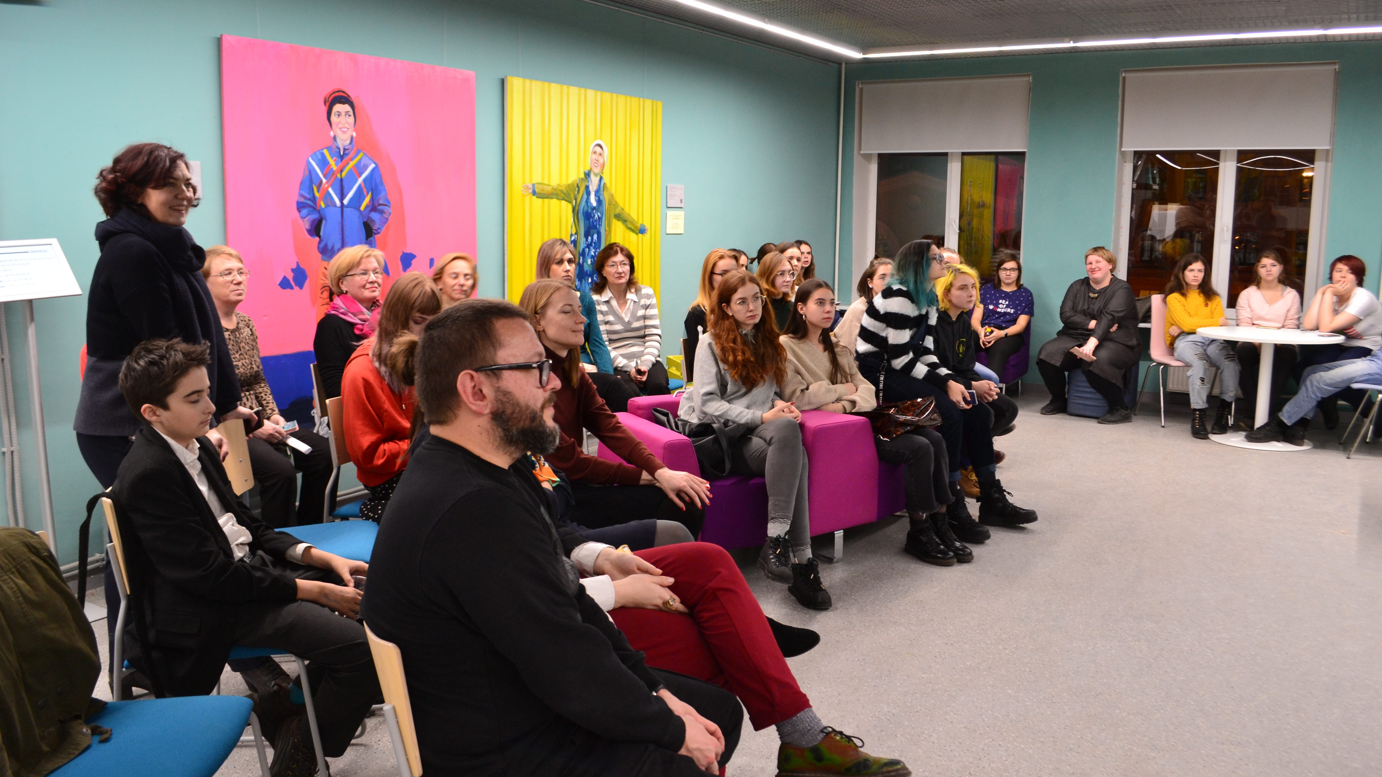 То ли дело в гостеприимном питерском корпусе на набережной канала Грибоедова, то ли в искренних словах, сказанных выступающими, но открытие выставки получилось таким уютным, что совсем не было ощущения учебного пространства вокруг. Скорее, все напоминало квартирник. Отчасти на это повлияли масштабные картины, появившиеся на стенах внутри корпуса. На мероприятии выступила как сама художница, так и администрация Вышки. Например, академический руководитель ОП «Филология» Джонатан Платт, который оказался старым другом создательницы картин.