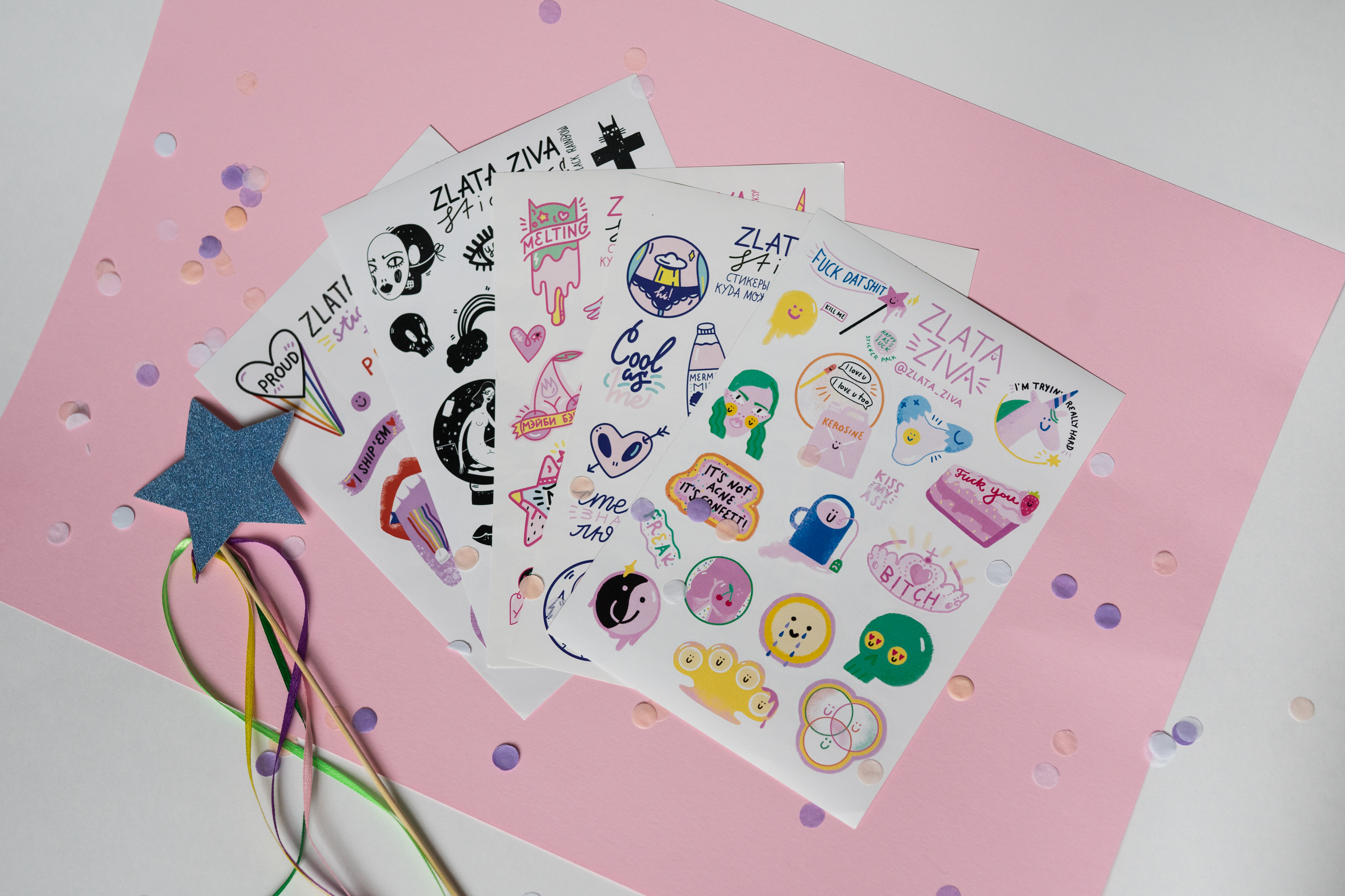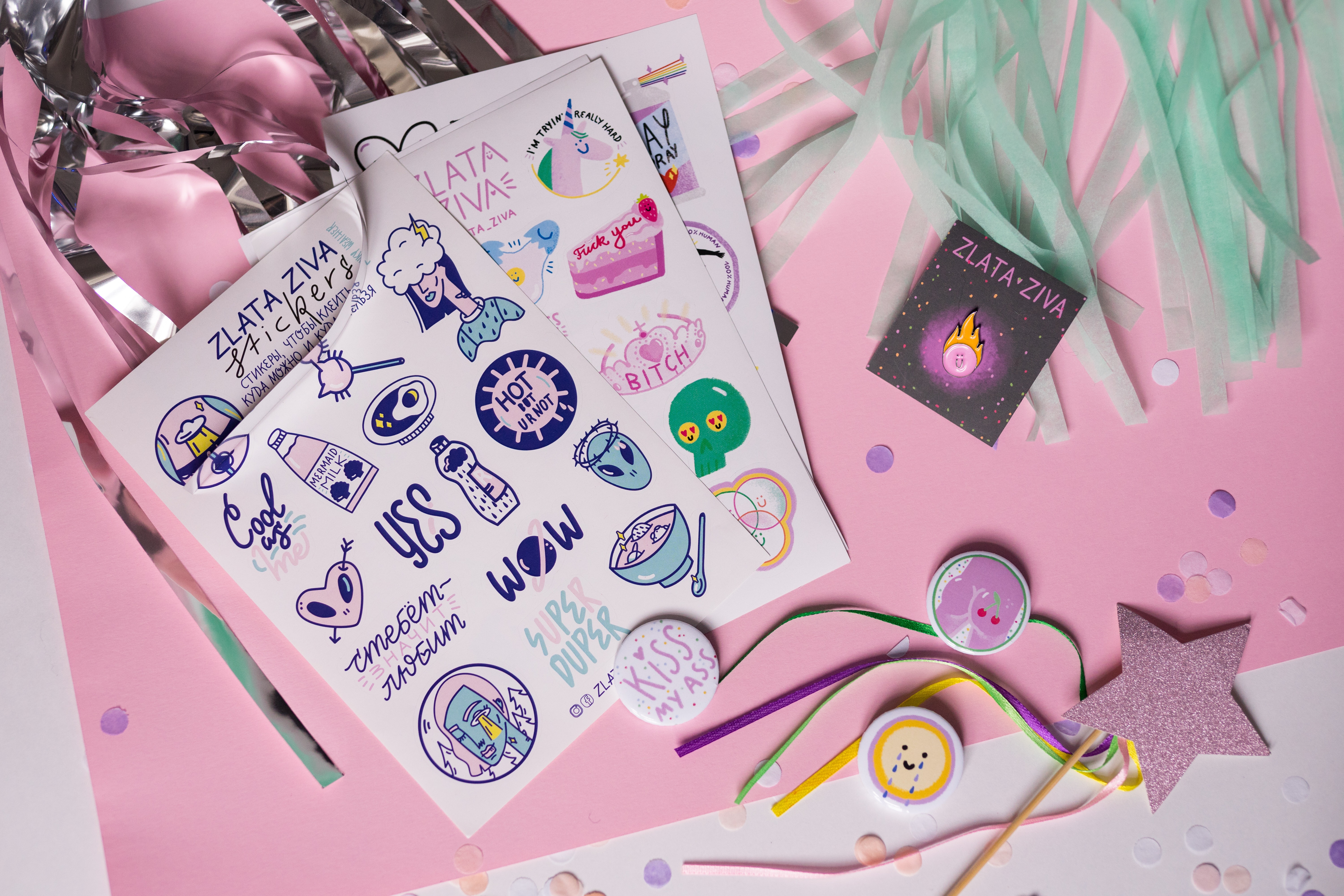 Наверное, стикеры — это то, за что меня знает и узнает большинство людей. Самые первые стикеры я печатала еще в Вышке на самоклейке и просто вырезала сама, а потом уже стала печатать полноценные стикерпаки и продавать их в магазинах. Мне казалось, что я как какой-то эксгибиционист — всем пишу и предлагаю нарисовать что-то. Стучась во все двери, я дошла до музея современного искусства «Гараж», прислала свои рисунки и предложила размещение в магазине на территории музея. Идея понравилась, и теперь мои стикерпаки можно найти и там.