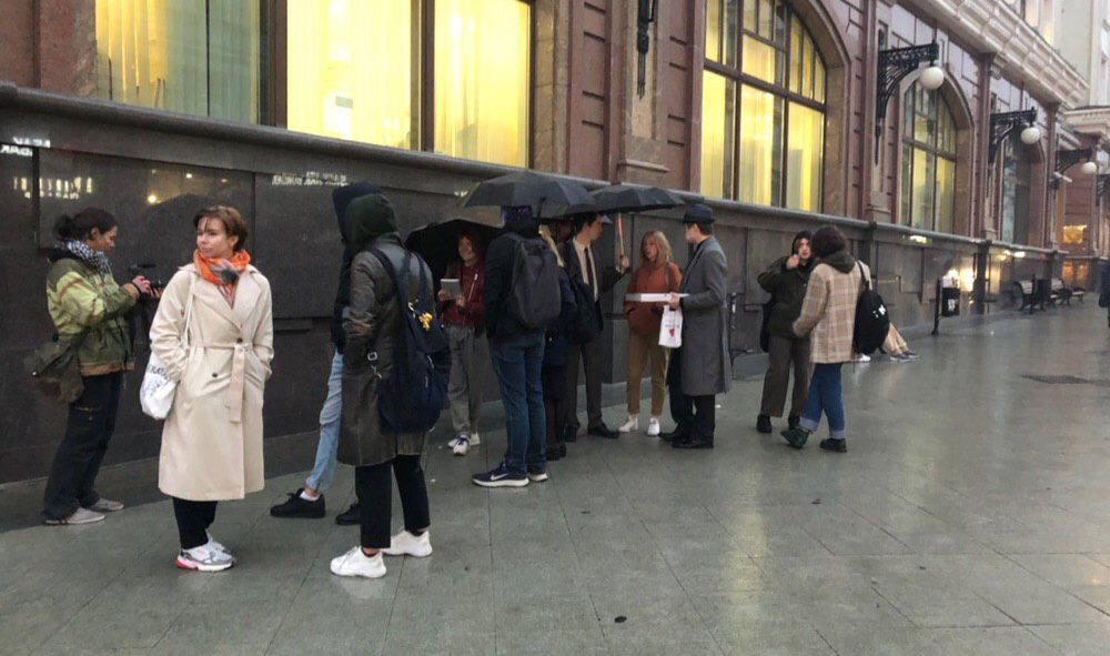 Сотрудник полиции сделал замечание о том, что рядом не должно быть двух развернутых плакатов одновременно. Ребята и так знали об этом, поэтому правила не нарушали: «Человек стоит. Потом сворачивает плакат, отдает Артему. Артем достает другой плакат из пакета и дает другому человеку. После этого он его разворачивает и встает. Мы четко следили за тем, чтобы не было одновременно двух плакатов развернуто.