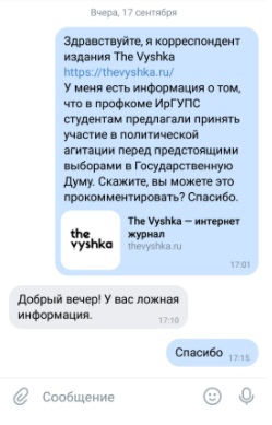 The Vyshka получила ответ только от председателя Первичной профсоюзной организации студентов ИрГУПС Ольги Лабыкиной, которая отрицала информацию о том, что профсоюз предлагал студентам участвовать в агитации.