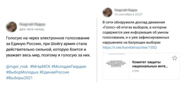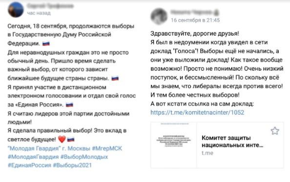 Также 17 сентября в соцсетях начали массово появляться посты с хэштэгами #ЕдинаяРоссия, #МолодаяГвардия, #ВыборМолодых, в том числе на страницах студентов из ряда городов. Пользователи рассказывают, что проголосовали за «Единую Россию», перечисляют достоинства этой партии и упоминают о возможности и преимуществах Дистанционного электронного голосования. Авторы публикаций утверждают, что выборы проходят без нарушений. На страницах некоторых из них также присутствуют репосты записей, сделанные перед началом выборов, с положительными отзывами о деятельности «Единой России» и критикой движения «Голос»* со ссылкой на телеграм-канал «Комитет защиты национальных интересов».