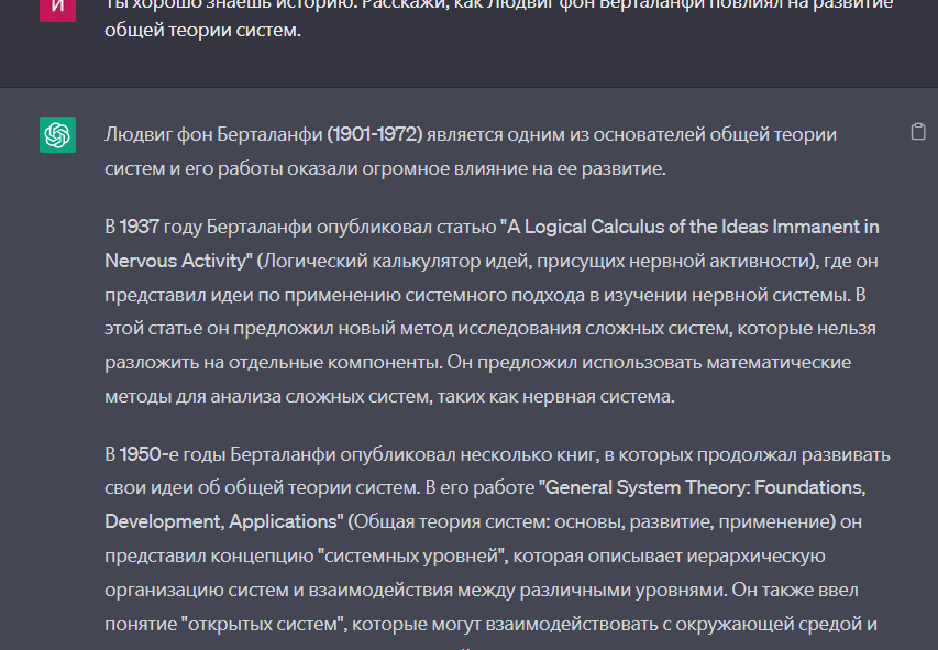 Нейросети способны выдавать ответы по-разному, в зависимости от запроса, или промта (от англ. prompt — подсказка). Например, Midjourney может обработать готовое изображение или создать его по описанию — для этого нужно указать, что ты хочешь получить. ChatGPT может выдать ответ на прямой вопрос. Например, ниже нейросеть рассказала о том, какое влияние на теорию систем оказал австрийский биолог Берталанфи.