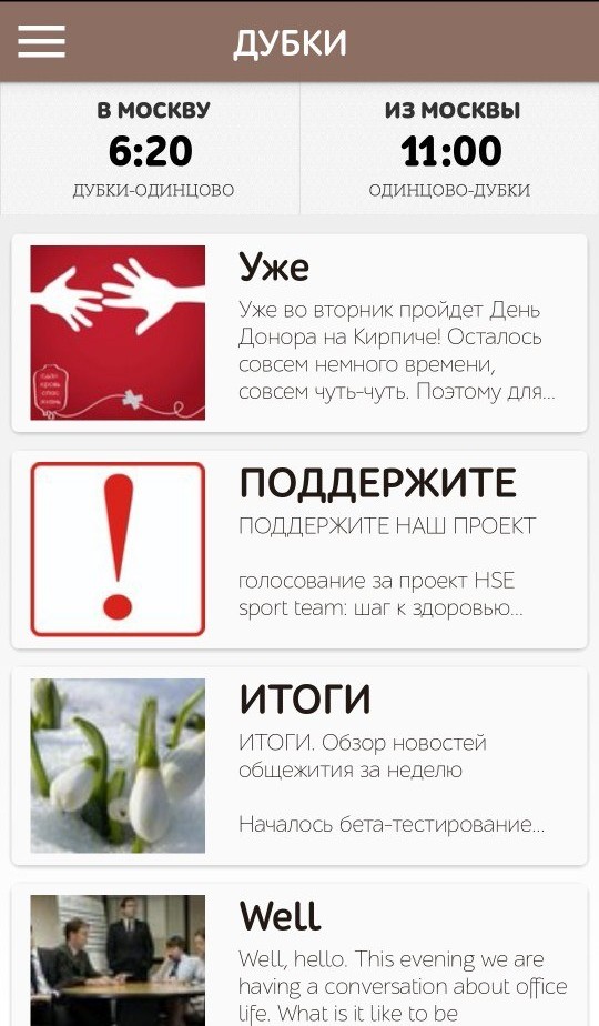 Олег: Приложение Дубки сильно упрощает жизнь студента. Теперь не нужно отдельно открывать расписание автобусов и электричек, заходить в группу ВКонтакте для просмотра новостей и прочее: все это объединено в одном приложении. На данный момент приложение включает в себя основной функционал, который со временем будет расширяться.