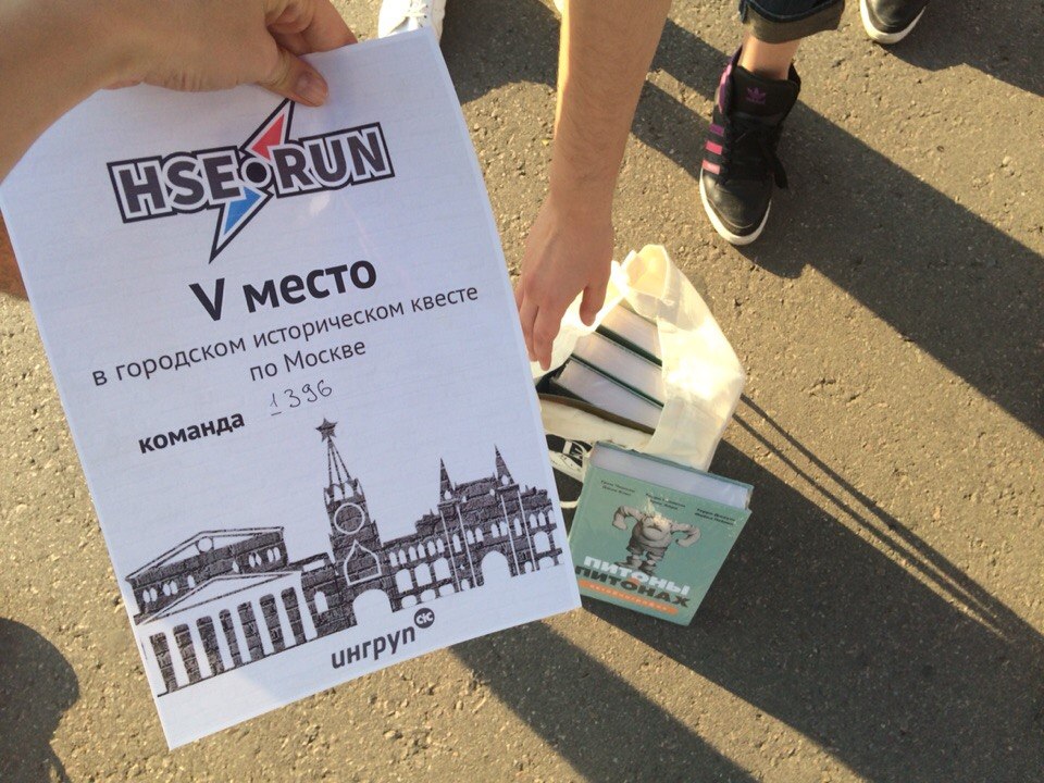 П. К-Л.: Мы заняли пятое место в общем зачете (команда 1396 – это мы) и были приятно удивлены, когда получили призы. Призов хватило для онлайн-квеста, для награждения и даже для конкурса после квеста, на самый креативный слоган HSE RUN. Первое место ушло слогану: «HSE RUN, почувствуй себя тупым», а нам досталось третье за слоган: «Эволюция в движении».