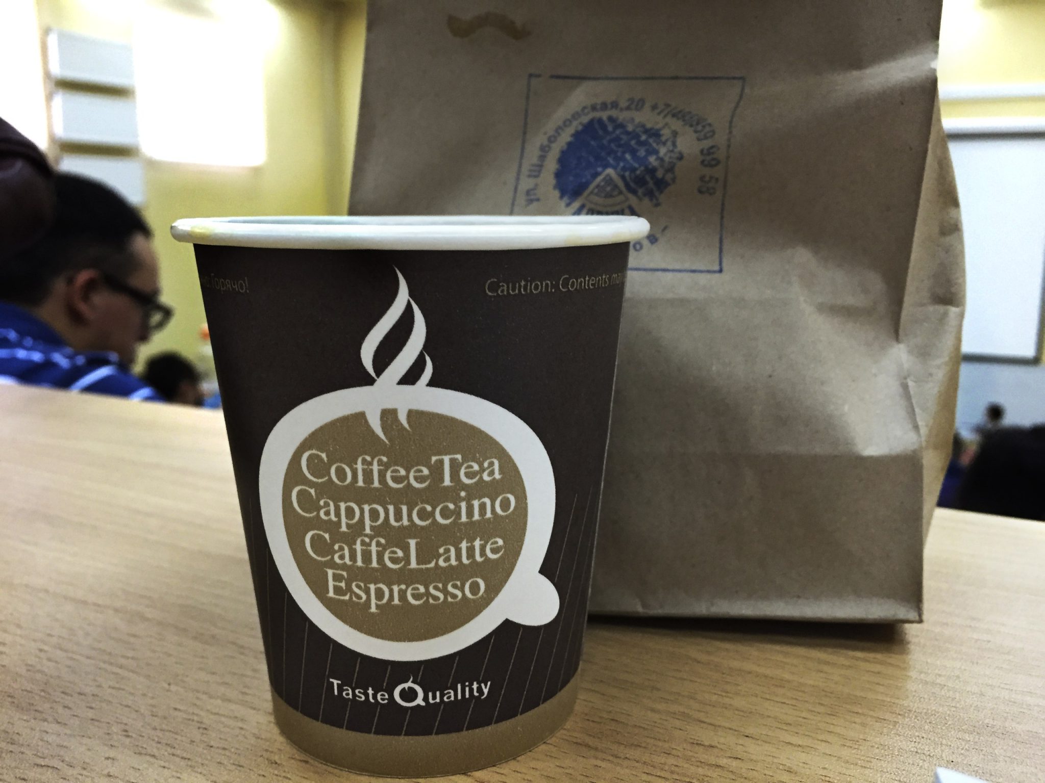 Вкусно, недорого, в стаканчике плещется 250 мл бодрости. За 299 рублей Вам принесут кофе и ролл. В кофейне всегда много людей, поэтому минут 10 придется ждать. К счастью, это компенсируется лучшими стаканчиками, которые мы видели и относительной близостью от корпуса.