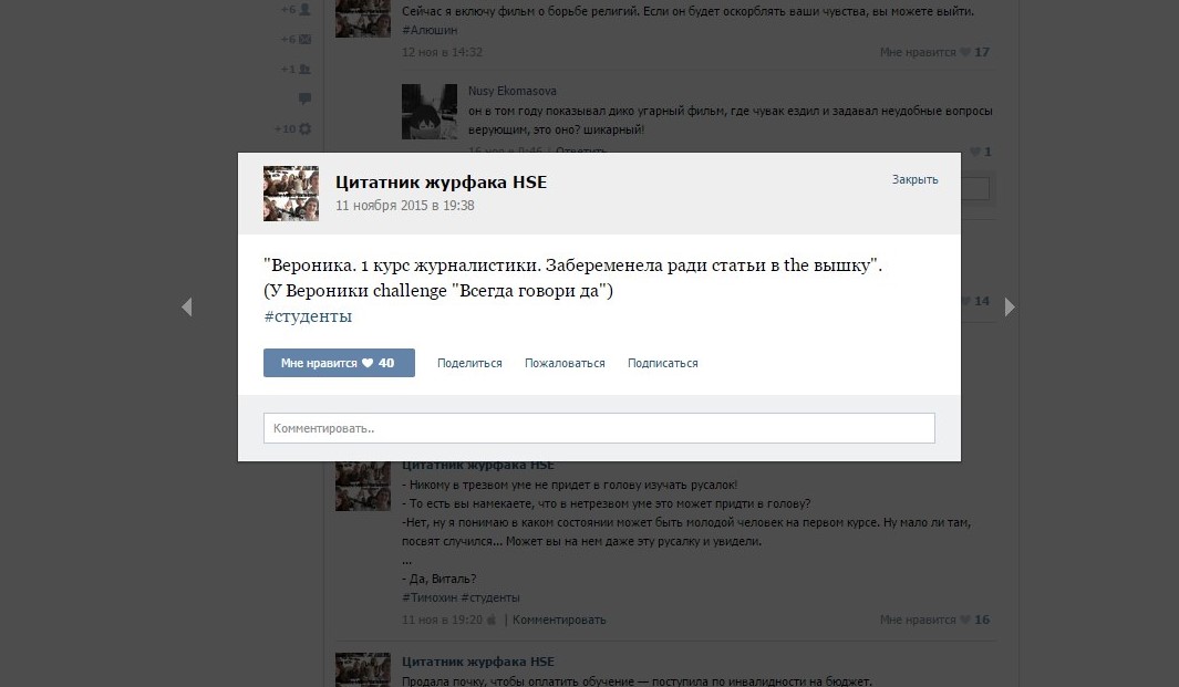 Затем начали появляться шутки о том, к чему могут привести мои опрометчивые «да», так что в какой-то момент я стала звездой одного вышкинского паблика с цитатами.