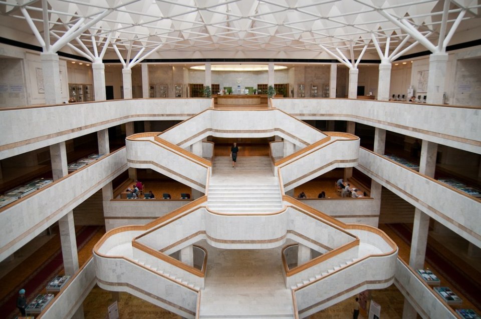 Библиотека сразу очаровывает своими масштабами и презентабельным видом. Внутреннее оформление здания завораживает своими стилевыми особенностями: высокие потолки, преобладание коричневых тонов, яркое освещение.