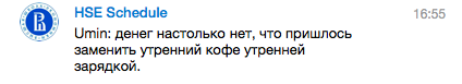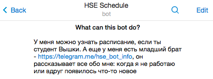 Достал одногруппников вопросами «Что сегодня у нас? В каком кабинете?», расписания нет под рукой, а приложение РУЗ тупит? Теперь достаточно всего лишь зайти в Telegram. Там кроме ваших переписок есть наш набор стикеров, бета-версия новостного канала The Вышки и бот с расписанием от компьютерного лингвиста
