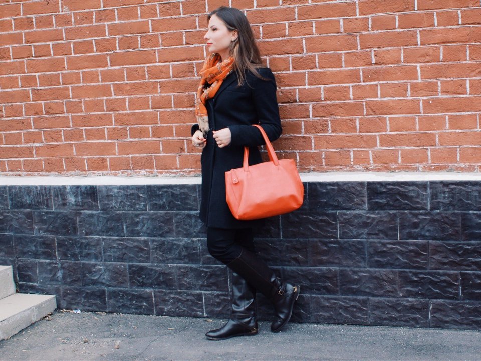Валерия: «Базовые приемы и классические оттенки заиграли по-новому, когда я накинула оранжевый платок и выбрала сумку ему в тон. Всего пара смелых штрихов способны добавить образу весеннего настроения».