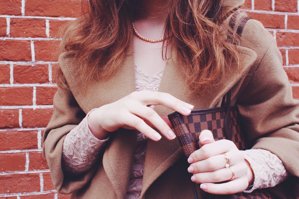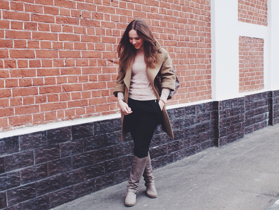 Мария: «Ранней весной хочется быть нежной и женственной. Но жизненный ритм изо дня в день диктует свои условия. Я выбираю практичность и непринужденность. В кофейном объемном пальто и с легендарной сумкой отправлюсь в университет, а после — на интересную встречу».
