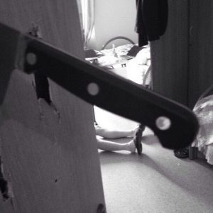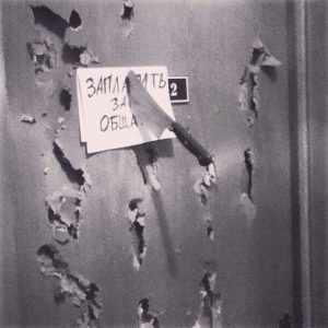Как-то раз немного повредили дверь в комнату, но, т.к. её всё равно предстояло менять, было решено не останавливаться на маленькой дырке и сделать небольшую инсталляцию. В то время постоянно администрация частенько пугала за неуплату денег за общагу. Стечение обстоятельств породило такую мысль. Украшена дверь, «убит человек», сделаны фотографии, и все выложено в сеть. Возможно, после этого все должники довольно быстро оплатили проживание. К сожалению, администрация не предоставила статистики, а мы и не спрашивали. Собственно, серия фотографий лучше, чем сама история.